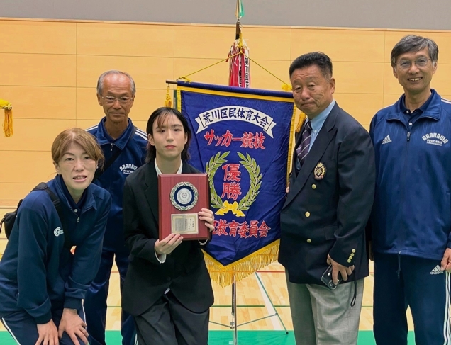 令和7年10月12日に行われた「荒川区民スポーツ大会 開会式」の席上、大谷萌さんが、(一社)荒川区スポーツ協会より「優秀選手表彰」を受賞されました。大谷さんはこのほど、「知的障がい者サッカー連盟」より、女子日本代表選手に選出され、今後の活躍が期待される選手です。大谷さんは地元の南千住サッカー広場少女部で小学生の頃よりサッカーを始め、現在は志村FCと文京LBレディースに所属し、日々練習に励んでおります。